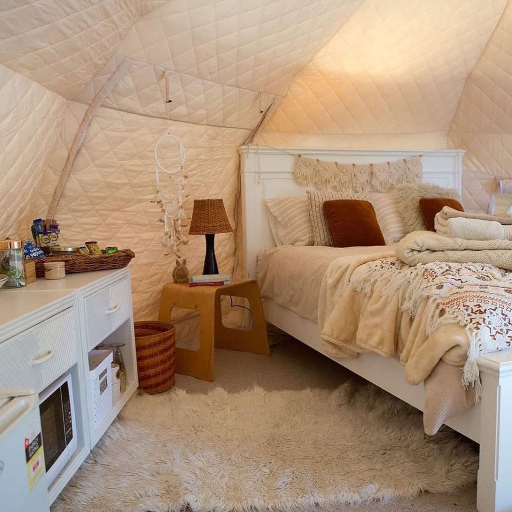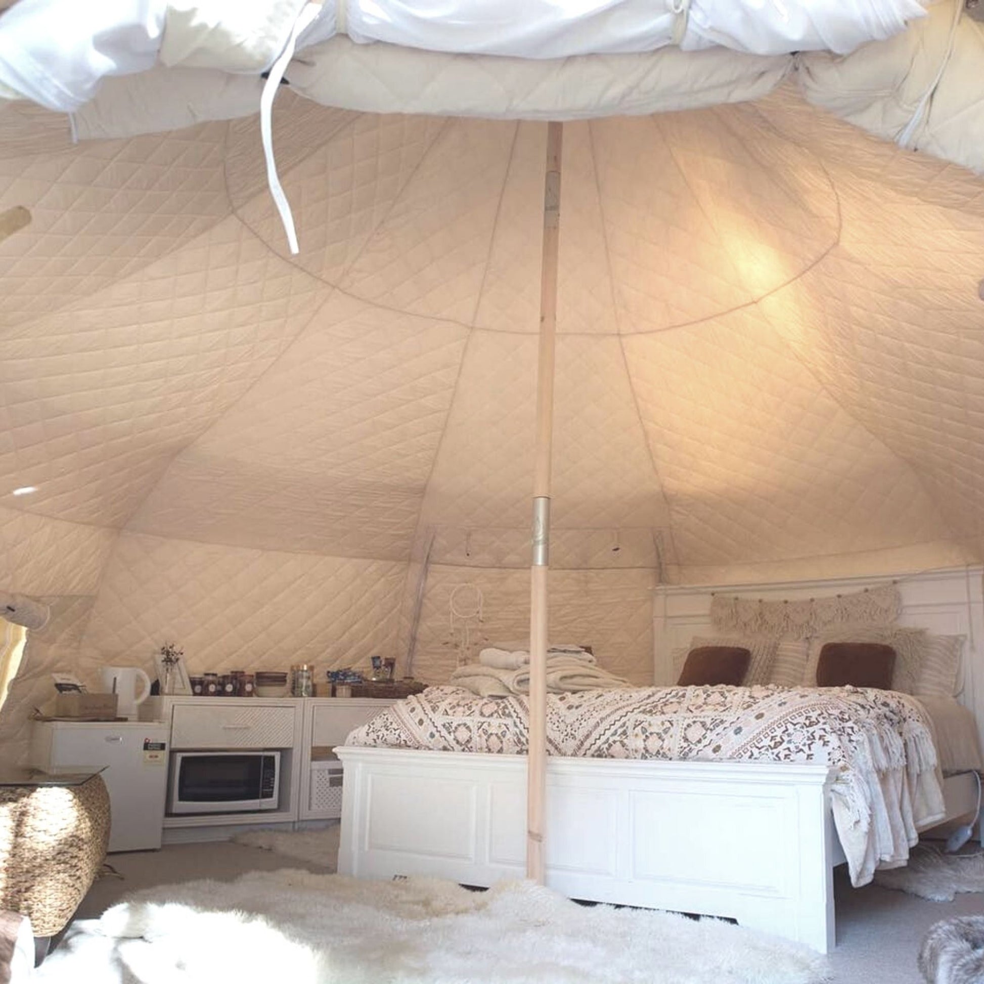 Insulated liners are essential for camping in colder climates, they are made from a thick quilted polyester that traps heat, like wearing a duvet inside your tent. This also makes them good for cooling! They fit over the center pole and clip around the wall poles hugging the interior shape.
